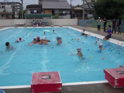 参加した児童を半分に分けて、プールに投げ込まれたゴム球