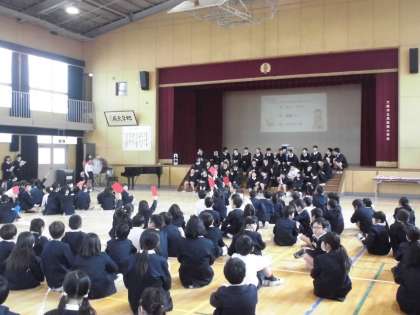 卒業を祝う会をしました。卒業する6年生を在校生みんなでお祝いをします。みんなでゲームをしたり、お祝いの言葉をみんなで言ったりしました。6年生からも素晴らしい演奏を聴かせてもらったり、記念品のぞうきんをもらったりしました。6年生との思い出ができました。