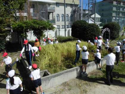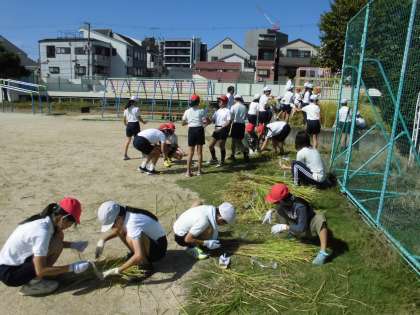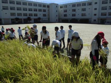 高殿南小学校の田んぼの稲が大きく育ってきたので、5年生のみんなで稲刈りをしました。