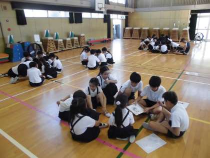 班ごとにオリエンテーリングの道順や地図の確認をしたり、班遊びの内容を話し合ったりしました。