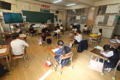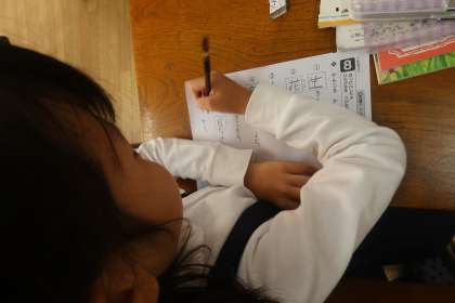 1年生が漢字テストをしていました。4月に入学からひらがなを習い、カタカナを習い、漢字となっています。日本語の表記は3種類あり、外国から見ても難しいと言われます。何より漢字は覚えないと使えません。みんながんばっていました。