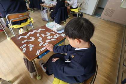 1年生が、算数でかあどとりをしていました。かあどとりというのは、「答えが4になる計算はどれ?」という発問に対し、「1+3」や「2+2}、あるいは「3+1」の式のかあどを取るのです。みんな楽しんでかあどとりをやっていました。