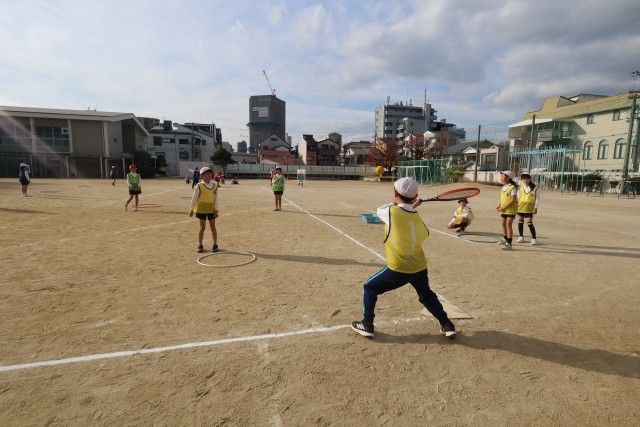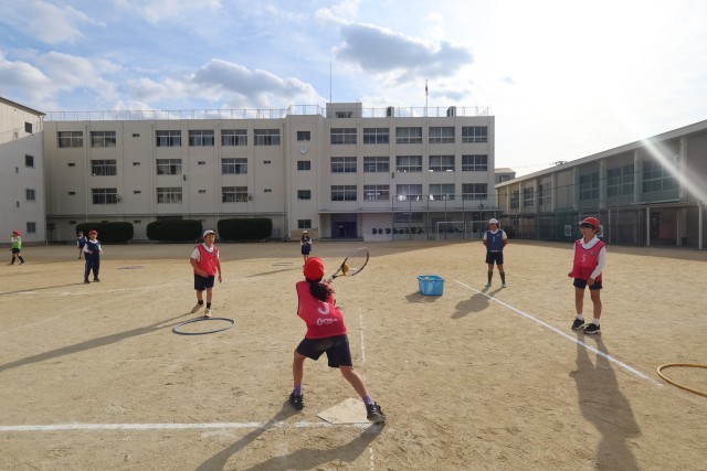 4年生が体育でベースボール型のゲームをしていました。ベースボール型というのは、攻撃の時間と守備の時間がゲームの中で切り替わる運動です。子どもたちは、攻撃の時、守備の時どうすればいいか友だちと知恵を出し合いながら話し合いをします。考えたことを試してみて、うまくいかなかったらまた考えてだんだんいいゲームになっていきます。