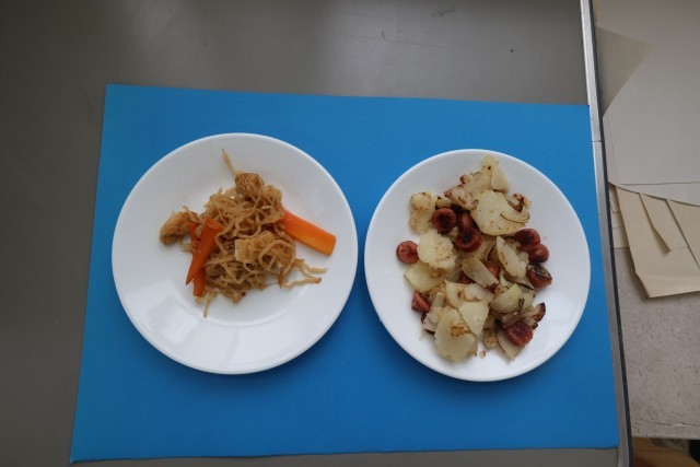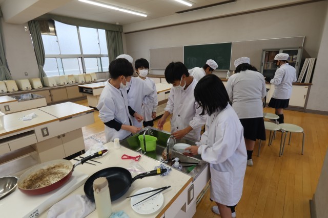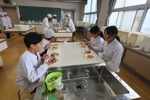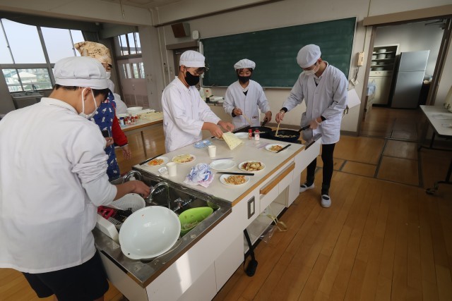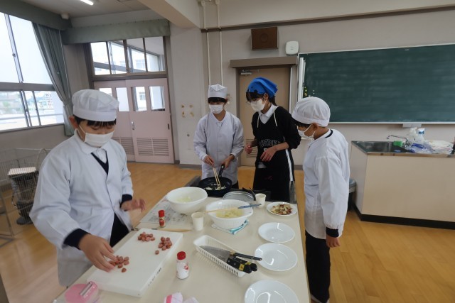 6年生が家庭科の調理実習をしていました。メニューは、切り干し大根の煮物とジャーマンポテトでした。調理実習も何回も行っているので、手慣れたものです。友だちと協力して楽しんで作りました。できたら「おいしい、おいしい」と喜んで食べていました。