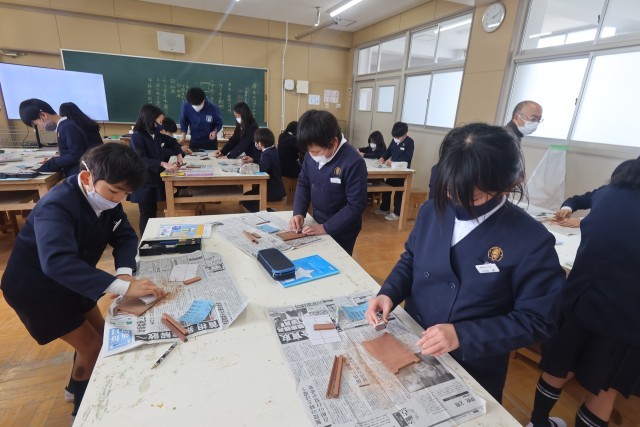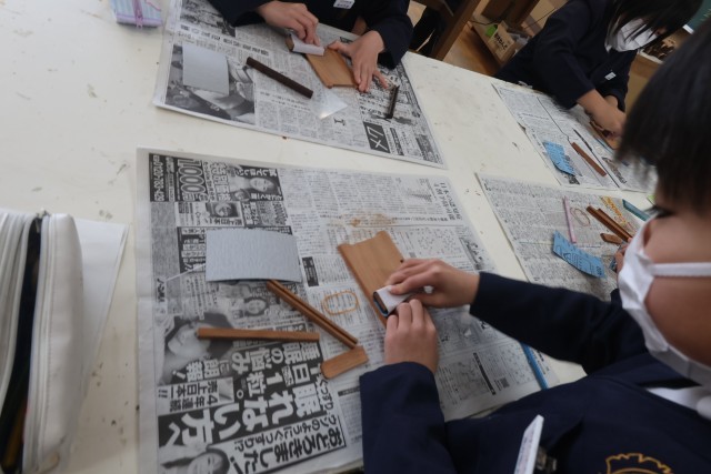 いよいよ5時間目は実習です。唐木というのは、もともとは中国の唐の時代に入ってきた外国の木という意味で唐木と呼ばれるようになったこと、そして非常に硬くて加工が難しい木であることを学習しました。140番の粗目のペーパーをかけ、その後800番の細かいペーパーをかけていきます。この過程を丁寧にすることが非常に重要で、売り物となったらこの仕事の出来によって値段が変わる重要な作業工程です。みんな真剣です。