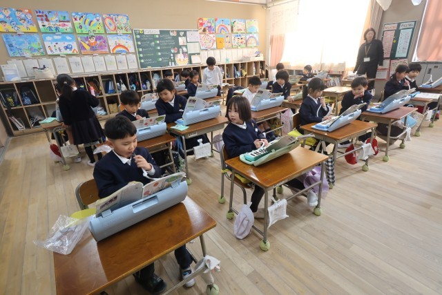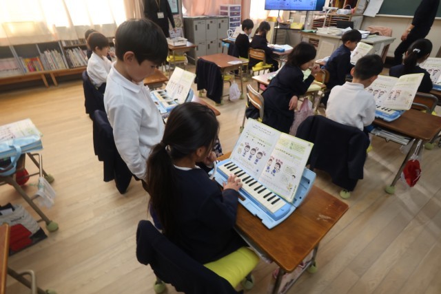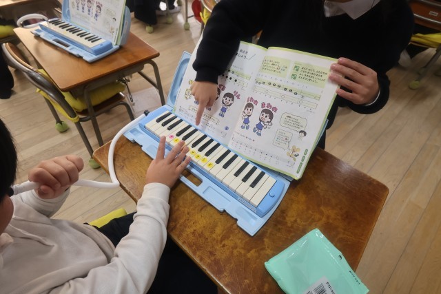 1年生が音楽でけんばんハーモニカの練習をしていました。隣の子同士で見合いっこするところでした。指使い、音の強さなどを見たり、時には指で押さえながらテンポをとったりしていました。4月から比べるとずいぶんじょうずになりました。