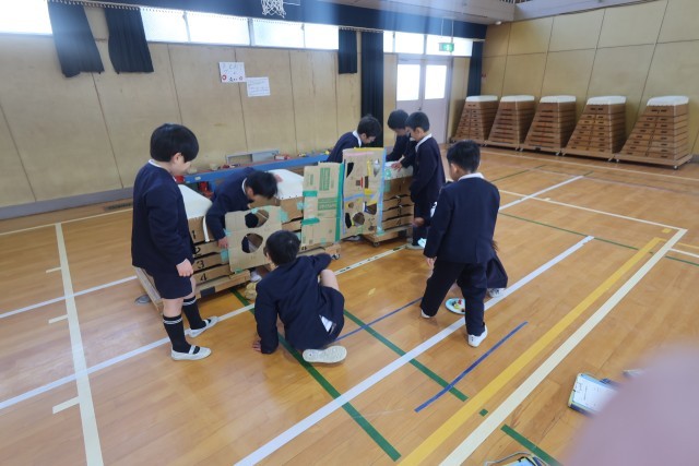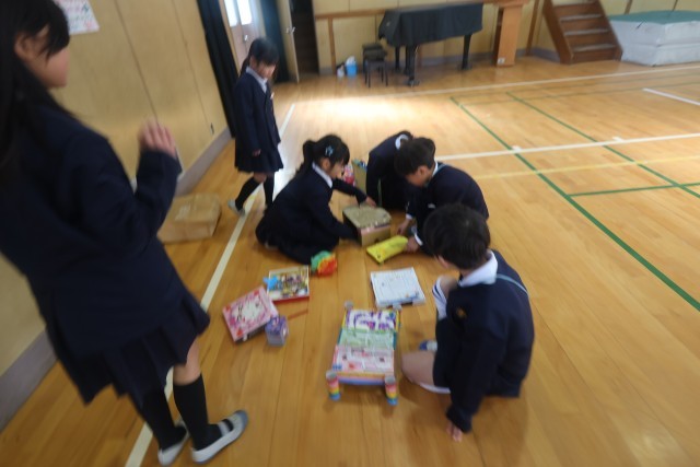 今日は2年生が作ったおもちゃで1年生が遊ぶため、おもちゃランドに招待されました。2年生は、遊び方を一生懸命説明し、1年生は、とても楽しんでいました。