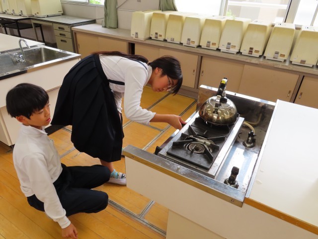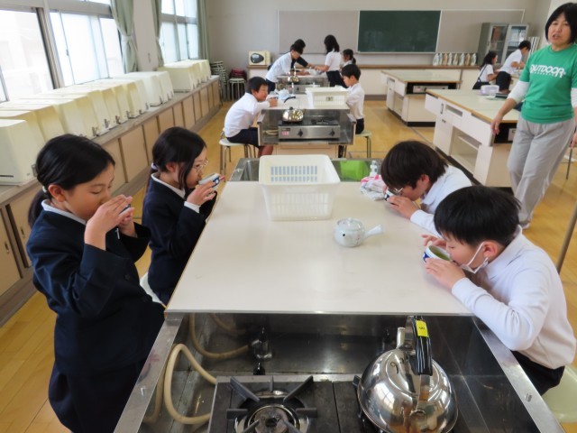 5年生が家庭科の調理実習でお湯を沸かしてお茶を入れて、飲みました。