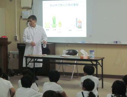 けがや病気になった時の薬の使い方や大麻や覚せい剤、シンナーなどの薬物の危険性について学びました。子どもたちは、実験や映像を見ながら薬物の恐ろしさを知るとともに、改めて安全で正しく薬を使うことの大切さを学ぶことができました。