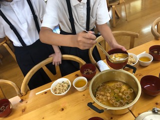 少し早めの昼食をとりました。メニューは、山菜五目ご飯とすまし汁とチキンナゲットでした。林間学習での思い出を語り合いながら、かねいちやでの最後の食事を味わいました。美味しい食事を作ってくださった宿舎のみなさんありがとうございました!全部美味しかったです!!!