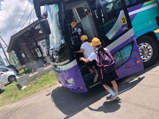 13時少し前にバスに乗り込み、かねいちやのオーナーさんに手を振って、学校へ向けて出発しました。バスに乗り込む子どもたちの姿は、少し寂しそうな顔をしていました。