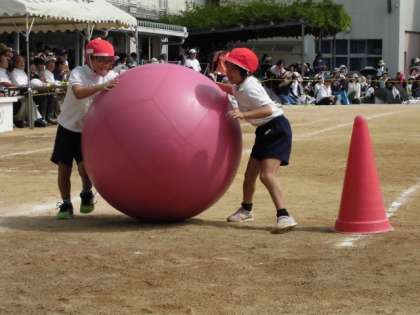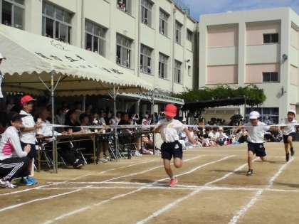 たくさんの方々に見ていただき、子どもたちは大満足の様子でした。青と白の2本の旗を振って踊り、「緊張したけど、楽しかった。」と大きな声で報告していました。「大玉転がし」も「ゴールめざしてダッシュ!」も、汗だくになりながら、力いっぱい頑張った1日でした。