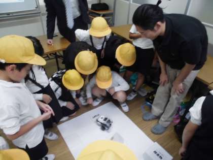 今年は、プログラミングを体験しました。レゴのソフトを使ってプログラミングし、車を操作するというものです。ほとんどの児童が初体験。少し不安げな表情を見せる児童もいましたが、友達と相談しながら試行錯誤を繰り返し、ねらい通りに車を動かせたときには「やったー!」と声を出して喜んでいました。児童が熱心に聞き入り、メモを取っていたのは「今からしておくとよいこと」です。