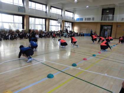 11月28日と12月5日の児童集会の時間に児童会が「スポーツファイヤー集会」を行いました。運動場では「どんじゃんけん」、講堂では「ぴょんぴょんがえる」をしてみんな仲良く活動しました。