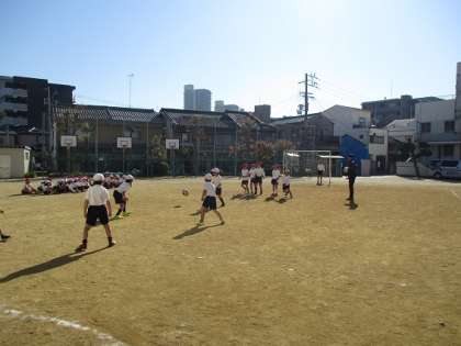 基礎の練習では、相手をよくみて動くことやドリブルのコツなどを教えていただきました。その後のコーチ対児童の試合では、チーム一丸となってボールを追いかけるなど楽しみながら取り組みました。