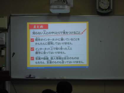 1月18日(土)の土曜授業で、5年生は「スマホ・携帯安全教室」でスマートフォンや携帯について学びました。スマホによるトラブルや、知らず知らずのうちに事件に巻き込まれる様子を描いた動画を見ました。「SNSって楽しいだけじゃないんだ…」と真剣な様子で学ぶことができていました。もう持っている人も、これから持つ人も、一度お家の人と話し合ういい機会になればいいと思います。