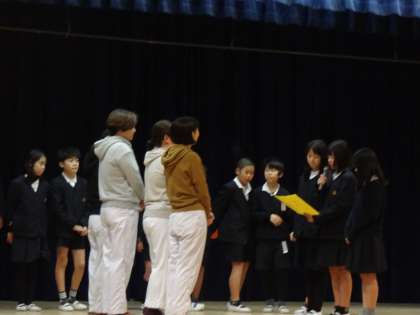23日(木)の児童集会では、給食委員会が学校給食週間にちなんでクイズをしたり、給食調理員さんに来ていただき、感謝の気持ちを伝えたりしました。