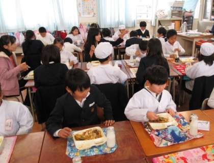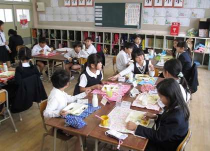 給食交流会を行いました。1年生は6年生と2年生は4年生と、そして3年生は5年生と楽しく給食を食べました。