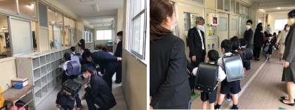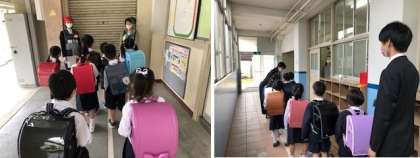 最初に講堂で校長先生や担任の先生のお話を聞き、その後、グループに分かれて、教職員の案内で学校探検をしました。今日は短時間でしたので、主に1年生がよく使う教室を中心に案内しました。