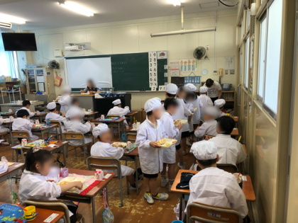 おかわりに行列が出来るほど人気なハヤシライスは、調理員さんが大きな釜で、心を込めて作ってくれていました。にんじんは、星型やハート型で型どったラッキーにんじんもあり、ラッキーにんじんが当たった子どもは喜んでいました。いつもおいしい給食をありがとうございます。