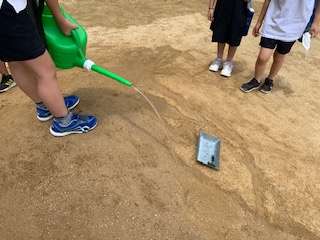 6月26日(金)4年生が理科の学習で「水の流れと地面のかたむきにはどんな関係があるのか」について調べました。