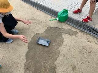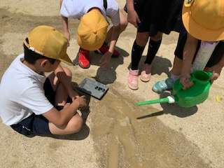 予想したことをもとに、じょうろを使って地面に水を流し、ビー玉が入ったバットを置いてみると、子どもたちは「地面の高いところから低いところに水が流れている!」や「地面の低いほうから水を流しても高いほうには流れていかない」ということに気づき、観察を楽しんでいました。