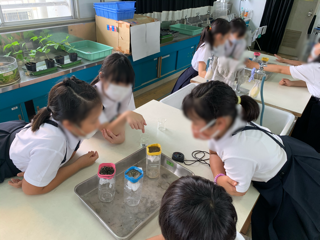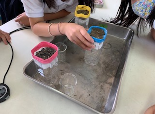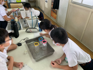 7月1日(水)4年生が理科の学習で「土の種類と水のしみこみ方にはどんな関係があるのか」について校庭の土、すな場のすな、じゃりの3種類の土を使って調べました。