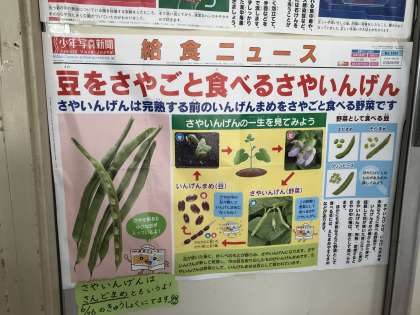 給食室の前にもえんどうまめに関するポスターが貼ってあり、学習と生活を結びつけるきっかけになればと思います。