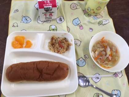 今日の給食は、パン、牛乳、パエリア、ウインナーとキャベツのスープ、みかん(缶)でした。パエリアは、カレー風味にしており、子どもたちはおいしそうに食べていました。