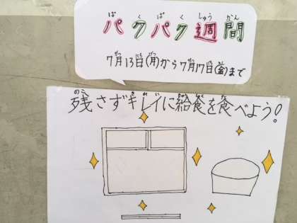 来週は、パクパク週間です。パクパク週間では、朝ごはん調べと給食の残食調べを行います。朝ごはんを毎日食べ、給食を残さずに食べるように頑張りましょう!