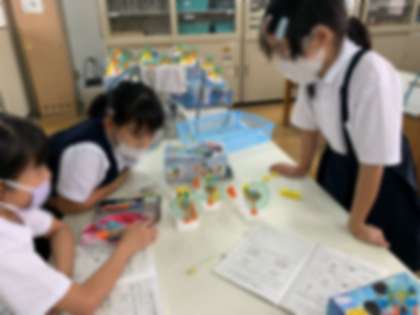 完成した3つの実験装置を並べて調べてみると、「乾電池2この直列つなぎが1番速く回る!」「乾電池2こでもへい列つなぎだと乾電池1このときとあまり変わらないんだね」など気づいたことを結果にまとめていました。