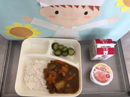 8月27日の給食は、「牛肉と大豆のカレーライス[米粉]」「牛乳」「きゅうりのピクルス」「りんごゼリー」でした。今日のカレーライスは、小麦アレルギーの人も食べられるように、小麦粉の代わりに米粉を使ったカレールウの素を使用しました。今日もカレーライスは大人気で、「おかわりしたよ」や「人気過ぎておかわりができなかった」など、給食をおいしく食べられた感想がよく聞こえました。明日もたくさん食べられると嬉しいですね。