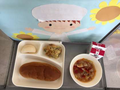 9月1日(火)の給食は、「黒糖パン」「牛乳」「豆乳マカロニグラタン[米粉]」「トマトスープ」「なし(二十世紀)」でした。9月、10月はアレルギー対応サポート月間です。今日のマカロニグラタンは、牛乳の代わりに豆乳を使用し、小麦粉のマカロニの代わりに米粉のマカロニを使用しており、乳、小麦のアレルギーのある子どもに配慮した献立となっています。今日は、今が旬のなしが出ました。今日のなしは鳥取産の二十世紀なしで、皮はきれいな黄緑色でした。なしは、水分が豊富なので、暑い日にはぴったりの果物です。