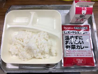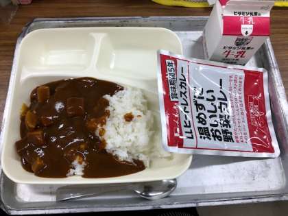 本日の給食は、給食室での調理ができないために簡易給食とさせていただきました。「野菜カレーライス(ヒートカレー)」「牛乳」でした。教室で子供たちがごはんにカレールウをのせて、おいしく頂きました。児童、保護者の皆様にはご心配、ご迷惑をおかけいたしましたが、安全でおいしい給食の提供に努めてまいりますのでご理解賜りますようお願い申しあげます。