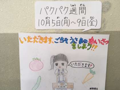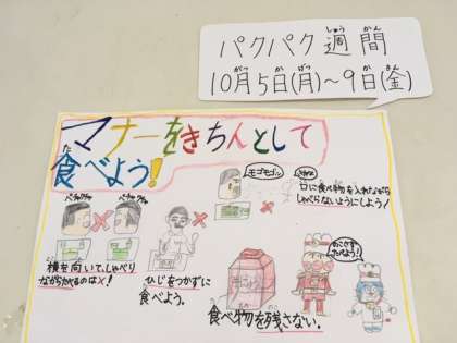 今週は、給食パクパク週間です。給食パクパク週間では、食べ物や作ってくれた人に感謝をしながら、健康のために給食をしっかりと食べる週です。