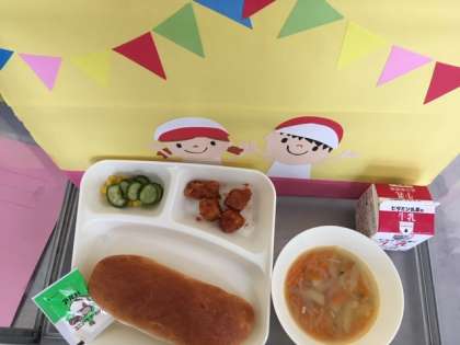 今日の給食は、「パン」「ソフトマーガリン」「牛乳」「まぐろのオーロラ煮」「ベーコンとじゃがいものスープ」「きゅうりとコーンのゆずドレッシング」でした。まぐろのオーロラ煮は、子どもたちに人気の献立で、おかわりに行列ができている学級もありました。