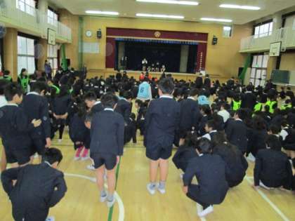 集会委員会の児童を中心に児童集会が行われました。今日は「船長さんが言いました」ゲームを行いました。みんなにこにこゲームを楽しんでいました。