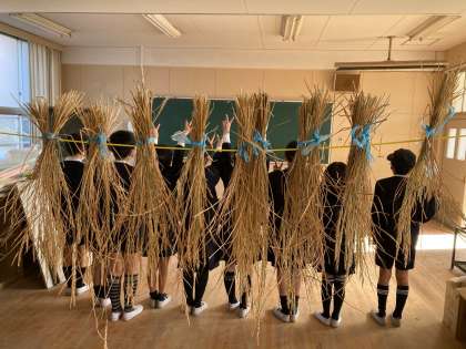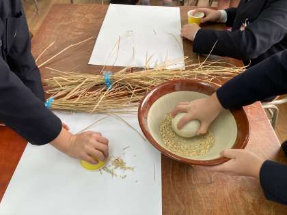 様々な工夫をしながら脱穀(だっこく)、籾摺り(もみすり)を行いました♪