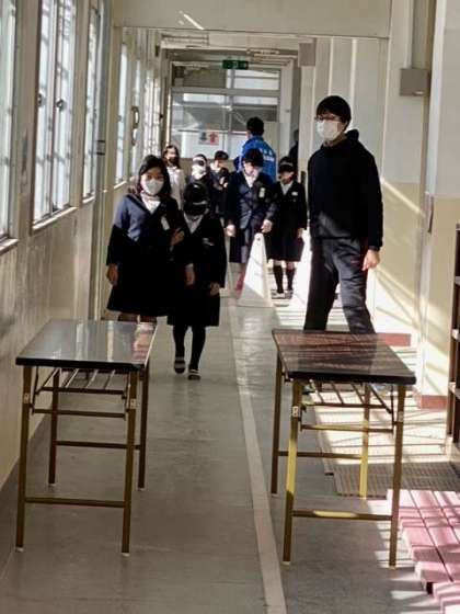 アイマスク体験は二人一組で行いました。一人はアイマスクを付けて細い道や、じぐざぐの道を歩いたり、階段を上ったり下りたりしました。もう一人は、「手引き」といって、道案内をしました。見えないことの不安と、案内することの難しさを体験し、自分にできることは何かを考えるよい機会になりました。