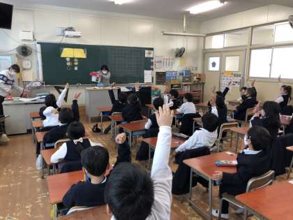 1年生で食に関する指導をおこないました。1年生は、ほとんどの子どもたちが給食を楽しみにしてくれています。しかし、半分以上の子どもたちが、野菜やごはんなど好きではない食べ物を残したり減らしたりしているようです。