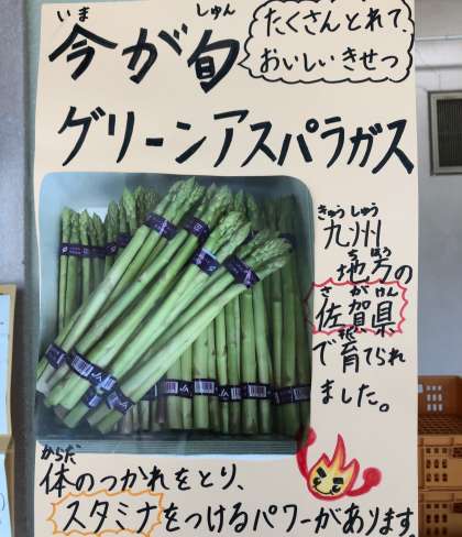 5月20日(木)今日の給食は、「黒糖パン」「牛乳」「かつおのガーリックマヨネーズ焼き」「ベーコンと野菜のスープ」「グリーンアスパラガスのソテー」でした。グリーンアスパラガスは、今が旬の野菜です。アスパラガスには、アスパラギン酸という成分が豊富に含まれており、体の疲れをとり、スタミナをつけるはたらきがあります。今日も「給食おいしかった。」と言ってもらえて嬉しかったです。