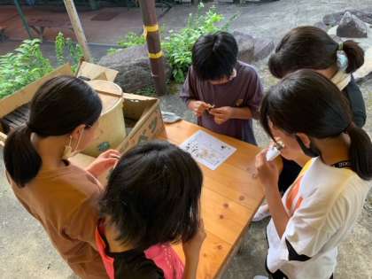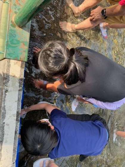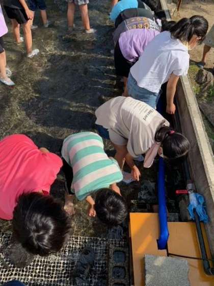 服を着替えて、次は魚つかみ!泳いでいる魚を手でつかむのは初体験という児童が多く、「難しい」「なかなかつかめない」と言いながらも、すごく楽しそうに取り組んでいました。つかんだ魚はその場で焼いてもらって、みんなでおいしくいただきました。