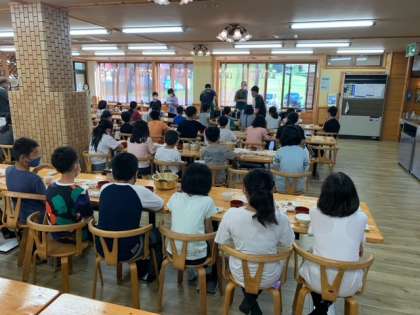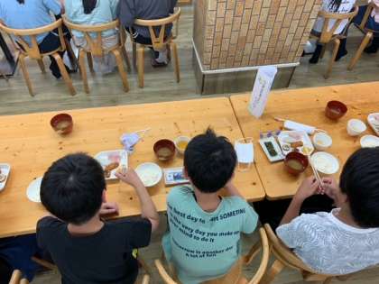 2日目の朝食です。時間通りに食堂に集合することができ、みんなそろって元気に「いただきます」をしました。友だちとわいわい食べる食事はおいしいですね。食べ終わったお皿は種類ごとに積んで、後片付けも協力してできていました。