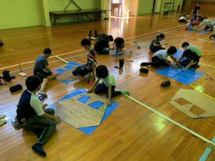 今日の一つ目の活動は凧づくりです。かねいちやのスタッフの方から作り方を教えていただいた後、活動班ごとに分かれて凧づくり開始。説明を聞いているときは簡単に思えた作業も、いざやってみるとなかなか難しかったようで、「まず穴から切るねんで」「竹ひご押さえといてくれへん?私テープ貼るから」など、互いに声を掛け合いながら進めていました。