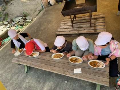 2日目のお昼ご飯は、自分たちで野菜を切って、お米を炊いて作ったカレーライスです。ピーラーでにんじんの皮を剥いたり、薪を使ってかまどに火をおこしたり、いろいろな経験ができました。出来上がりを食べた子どもたちは、「ご飯のおこげがおいしい」「カレールーだけ3ばいもおかわりしちゃった」と、嬉しそうにしていました。