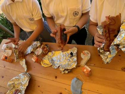 3日目の朝食はカートンドッグ。パンにキャベツとウインナーを挟んでアルミホイルに包み、それを牛乳パックの中に入れます。外側のパックに火をつけて、全て燃えたら出来上がり!アツアツでおいしくて、みんな大喜びでした。