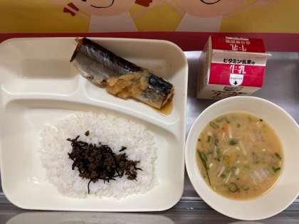 10月15日(金)今日の給食は、「ごはん」「牛乳」「さんまのみぞれかけ」「みそ汁」「牛ひじきそぼろ」でした。今日は、骨つきのさんまでした。骨のついたさんまを、みんな一生懸命食べていました。魚には、体をつくるはたらきだけでなく、脳のはたらきを助けたり、血の流れをよくしたりするはたらきがあります。秋においしい魚を食べて元気な体をつくりましょう。