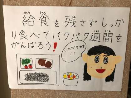 来週は、パクパク週間です。パクパク週間では、朝ごはん調べと給食調べをします。朝ごはんを食べて登校すると、授業に集中できたり、体を動かしやすかったり、とてもよいことがたくさんあります。朝ごはんを食べて、運動会の練習や勉強など、たくさん頑張ってほしいと思います。早ね・早起き・朝ごはんで元気な体をつくりましょう。