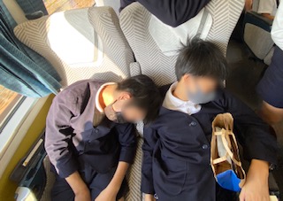 近鉄特急の車内もあと少しとなりました。それぞれに最後まで楽しんでいます。夢の中ではまだ鳥羽かな?
