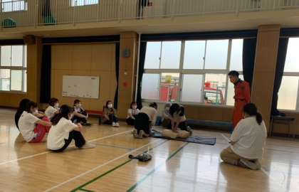 城東消防署の方4名に来ていただき、心肺蘇生法とAEDの使い方について教えていただきました。